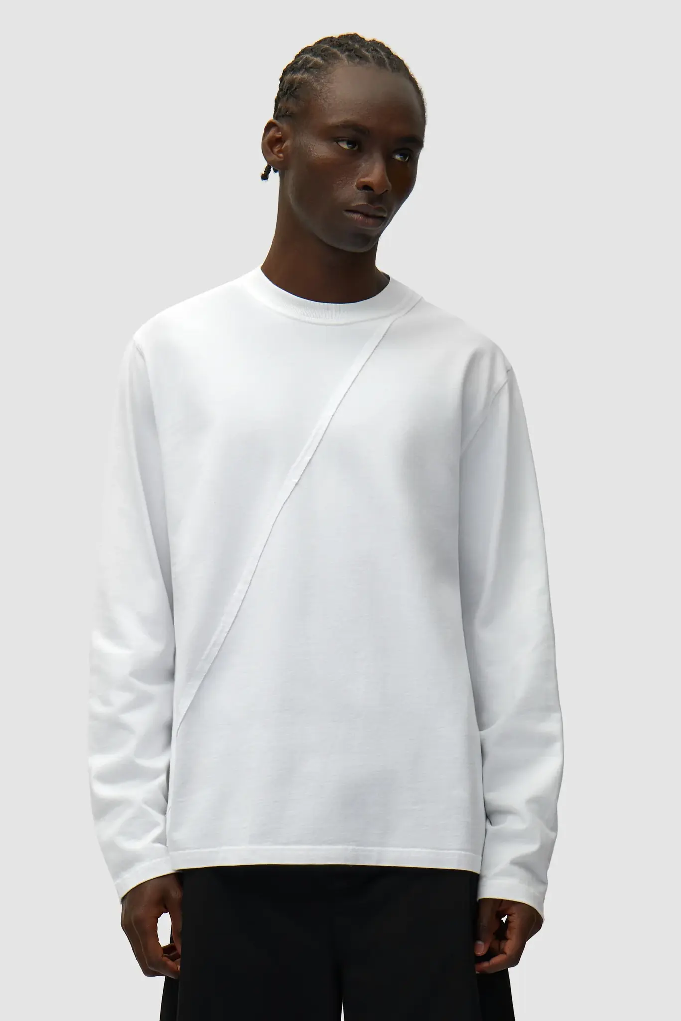 The graphic is divided by a seam that runs diagonally across the longsleeve, channeling the theme of the collection. Made from premium heavyweight cotton, the white longsleeve has a slightly higher neck and a relaxed fit.