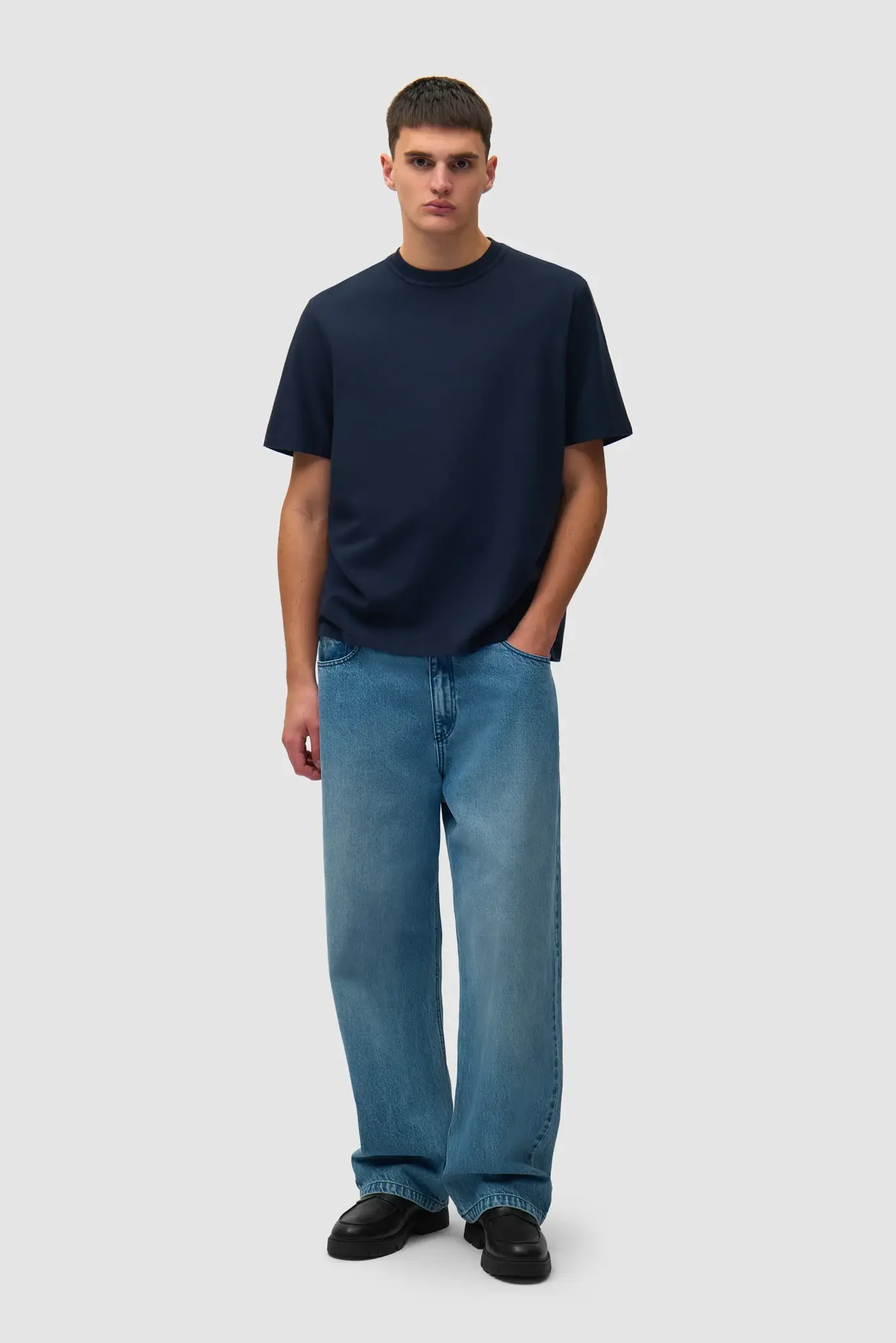 Made from premium heavyweight cotton, the navy T-shirt is soft to the touch with a slightly higher neckline and a relaxed fit.