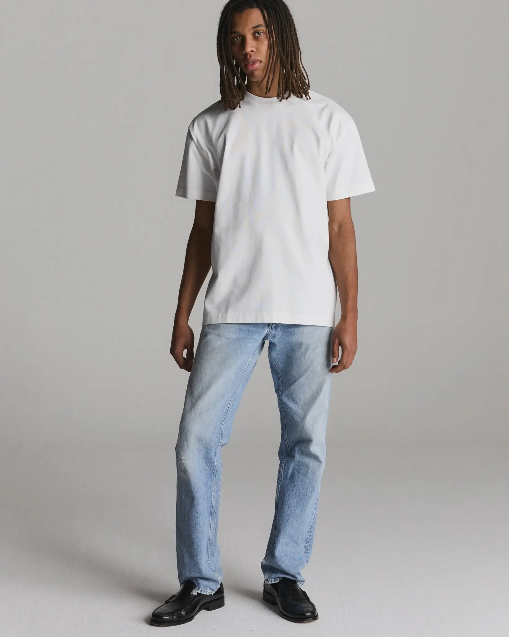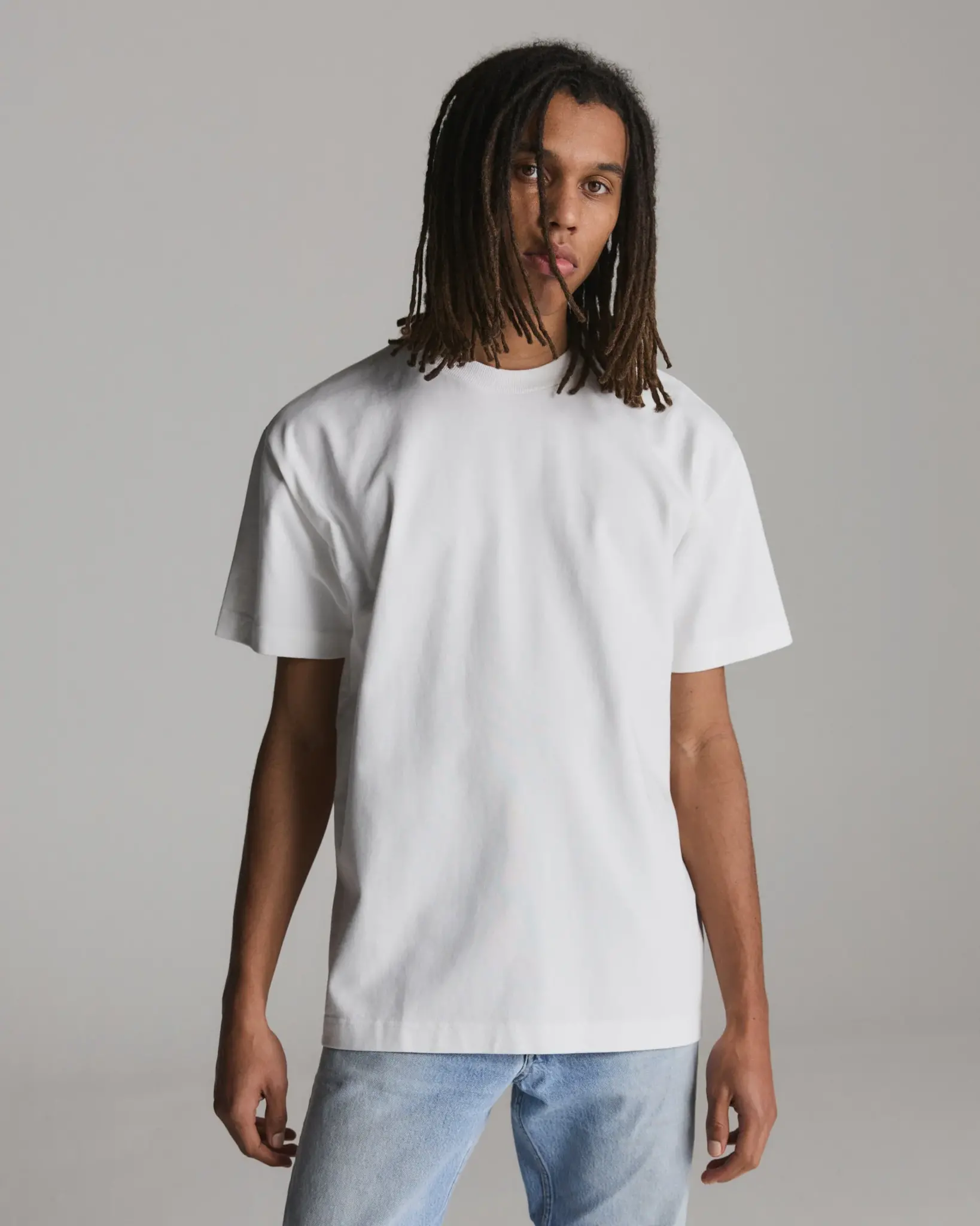 Our Tenue. Bruce is an oversized, heavy-weight T-shirt that is reminiscent of vintage American tees. A basic, yet meticulously produced essential. The T-shirts are made from a heavy 100% organic cotton fabric. Bruce features a ribbed neckline with a printed neck logo. The neck logo saves a piece of fabric and ensures maximum comfort. Bruce is made in our jersey factory in Portugal which has been around since the 60s.