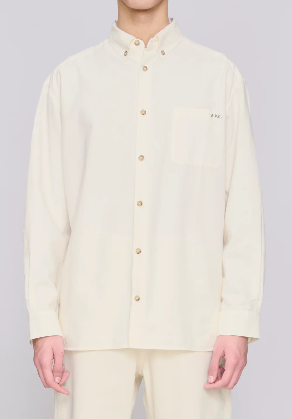 APCAPC Chemise Mateo Logo - Off White €220,00 Incl. btw Op voorraad S M L XLMaat: *SMLXLToevoegen aan winkelwagenDirect betalenGratis verzending Vanaf €100,-BeschrijvingSoft, slightly textured material. Straight cut with a loose fit. Button-down collar. One pocket over the heart embroidered with a contrasting A.P.C. logo. Faux horn buttons engraved "A.P.C." 100% organic cotton.