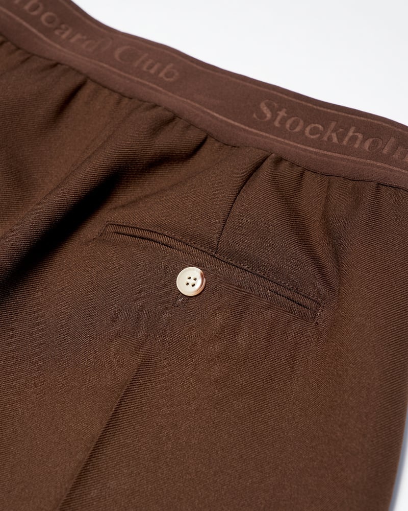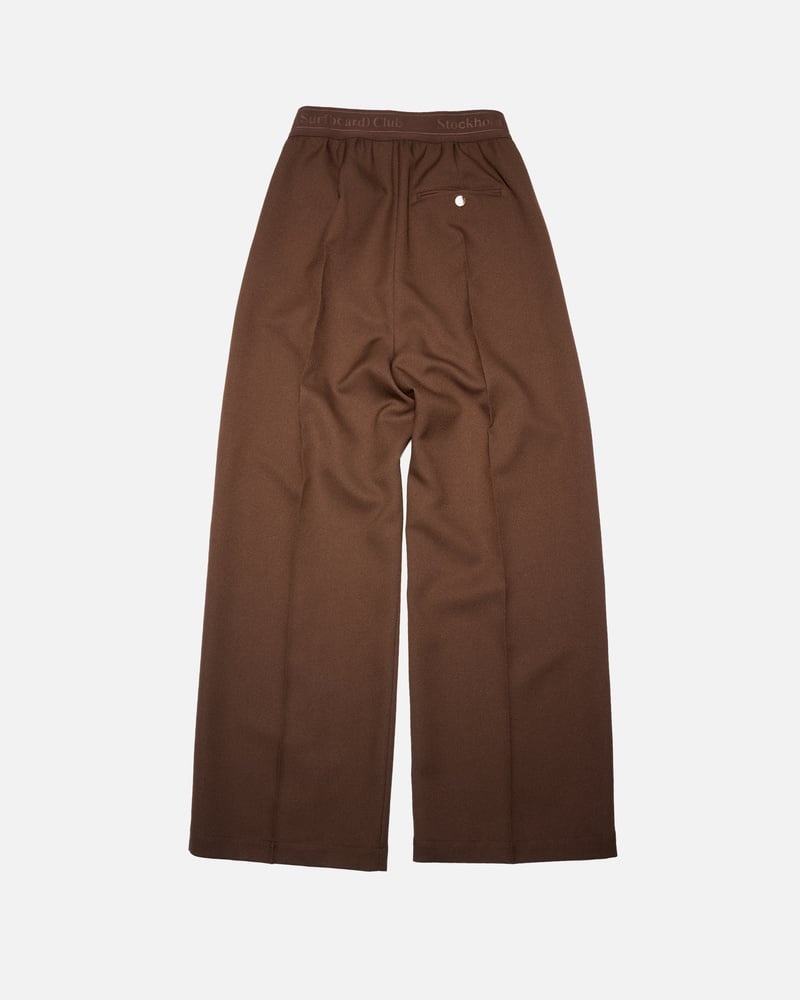 Stockholm Surfboard ClubStockholm Surfboard Club Elaine - Brown €290,00 Incl. btw Op voorraad M L XLMaat: *MLXLToevoegen aan winkelwagenDirect betalenGratis verzending Vanaf €100,-BeschrijvingStockholm Surfboard Club loose fit trousers with elastic waistband, slant pockets and press folds. Unisex item Loose fit Full length Press folds Slanted pockets Back pocket with button closure Elastic logo waistband