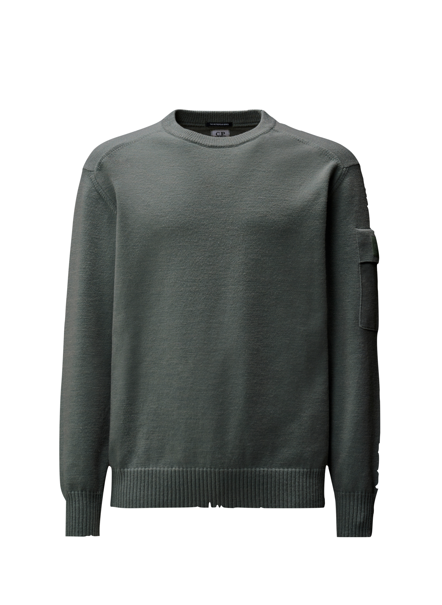 Crewneck sweater crafted in Extrafine Merino Wool. The sweater features a sleeve pocket with rubberized logo badge. Finished with ribbed cuffs and hem. Gauge 7. Regular fit.