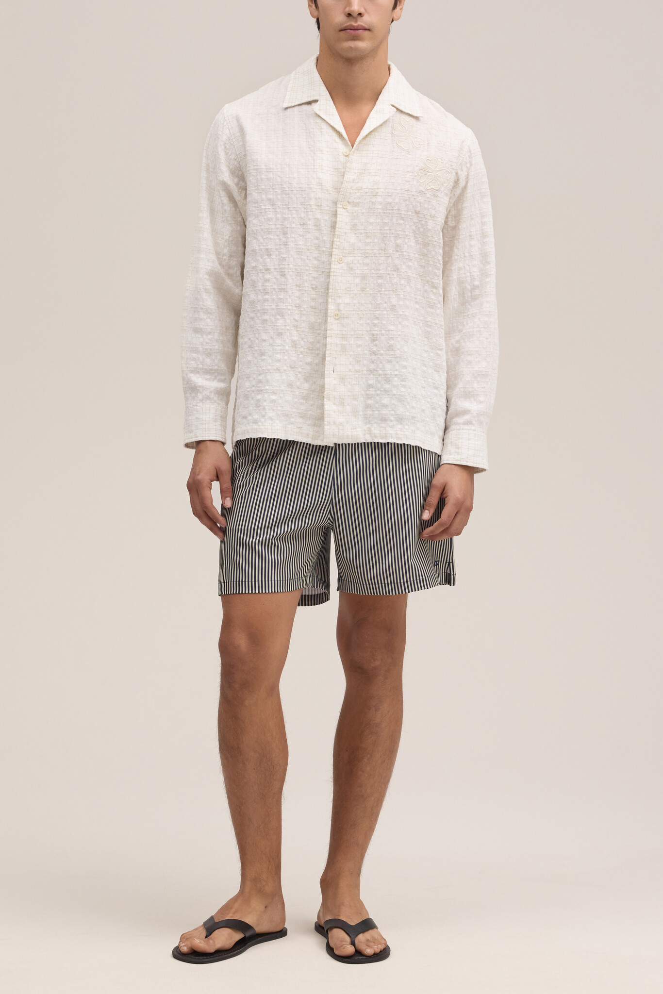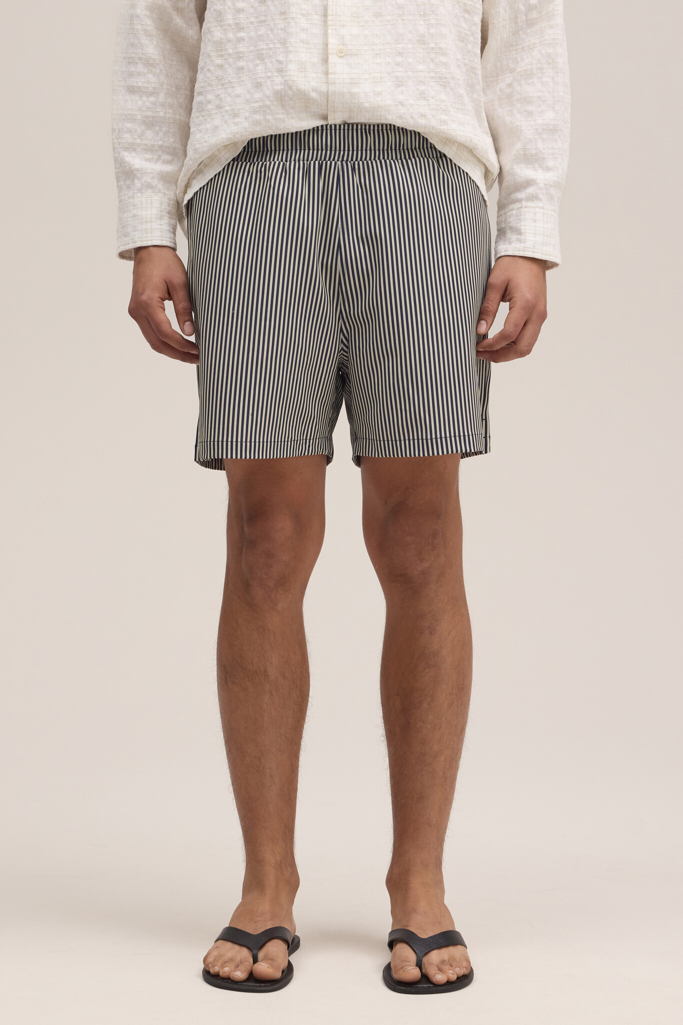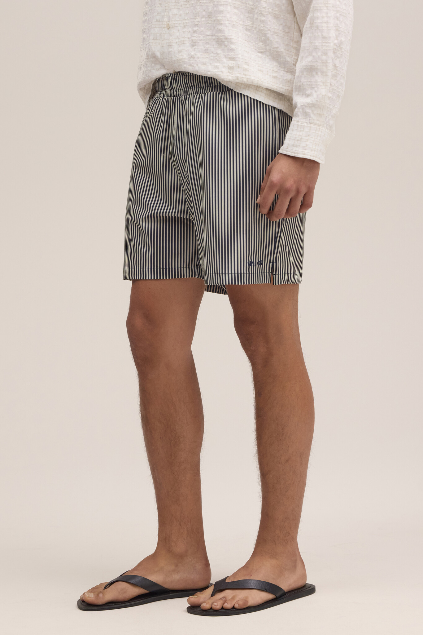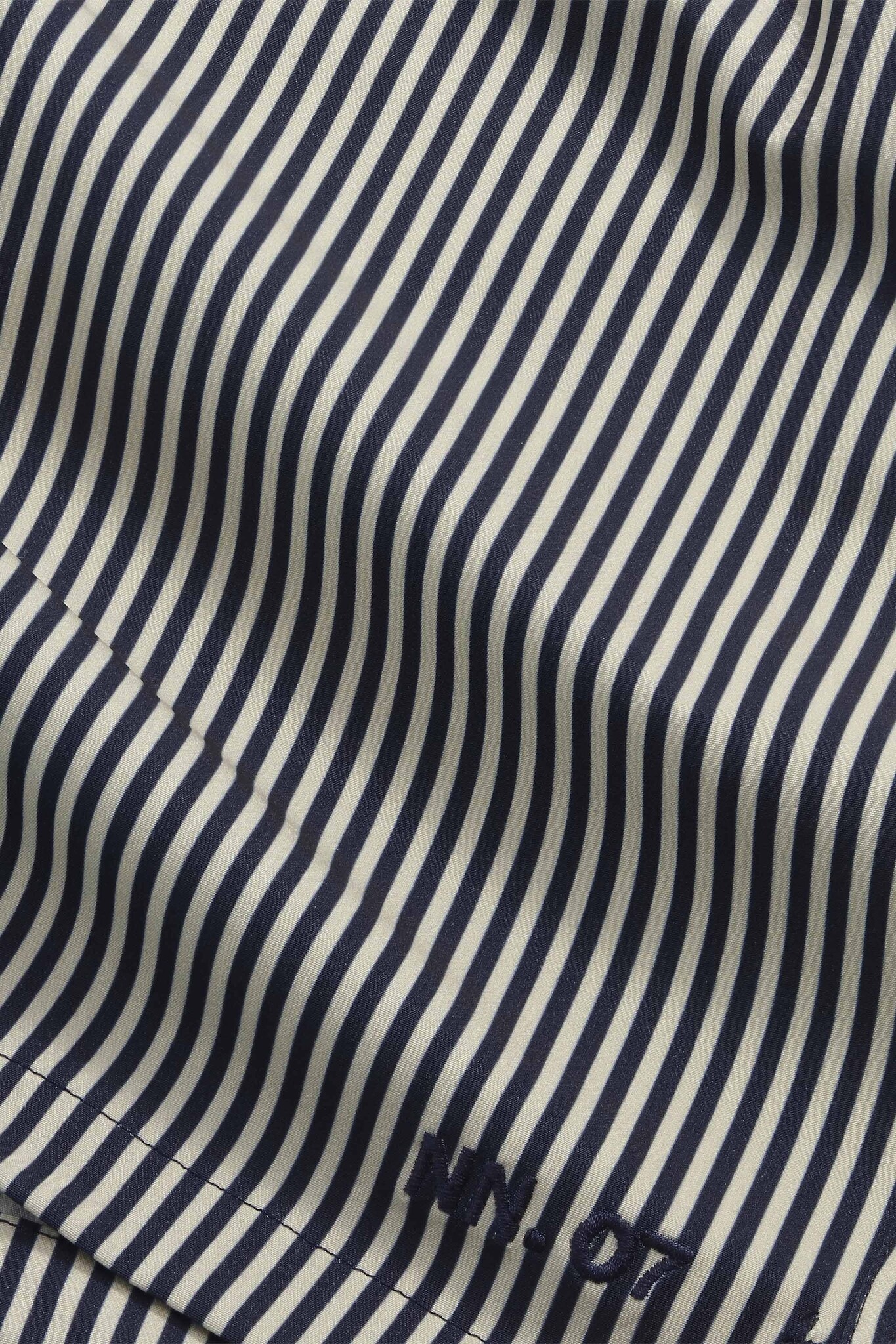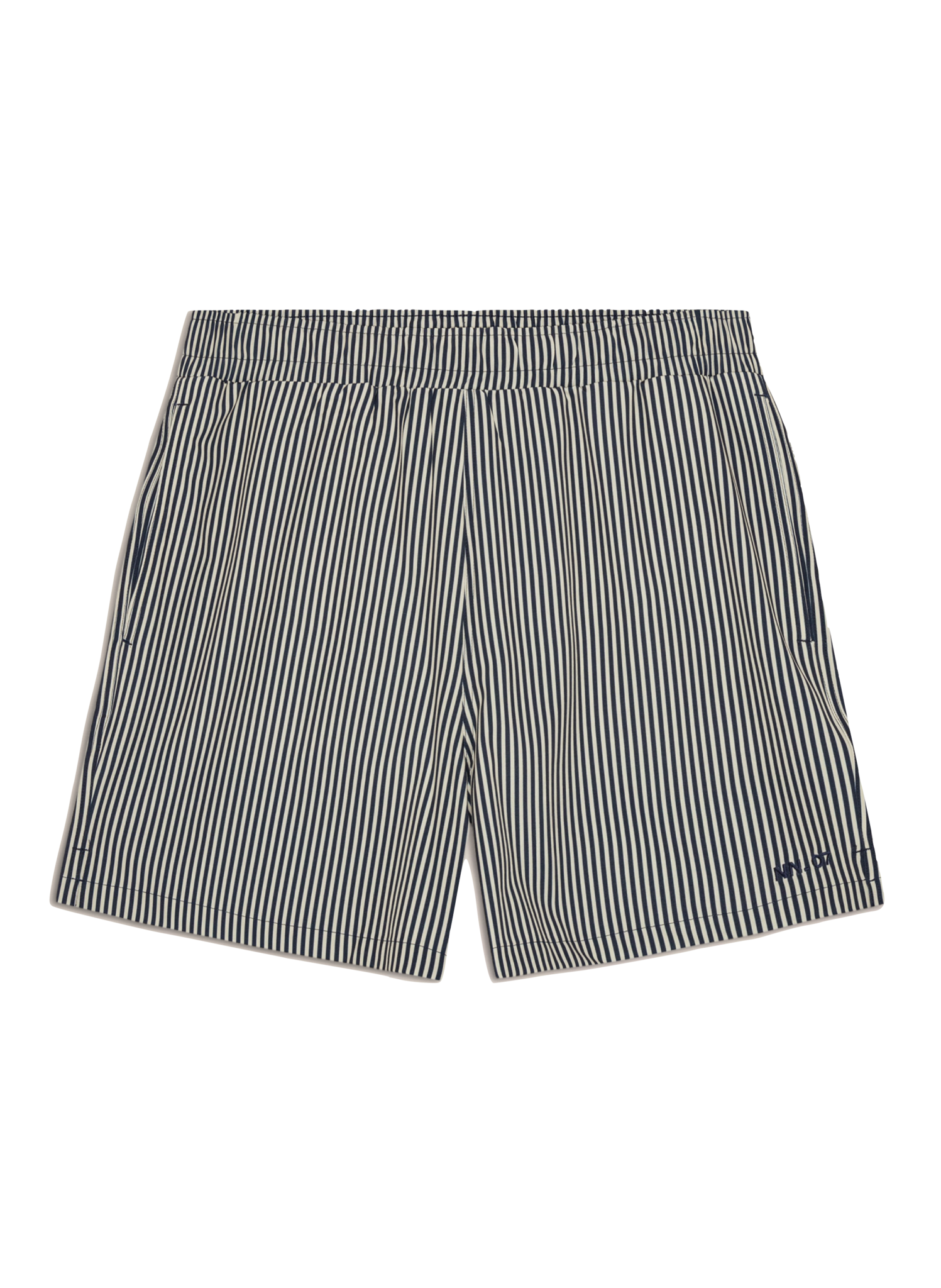 Swim shorts crafted from recycled polyester with elastane for stretch and comfort. Designed with a light and drapey handfeel, featuring an elasticated waistband with drawstring closure and a practical zip pocket at the back. Finished with NN.07 embroidery detailing at the front.