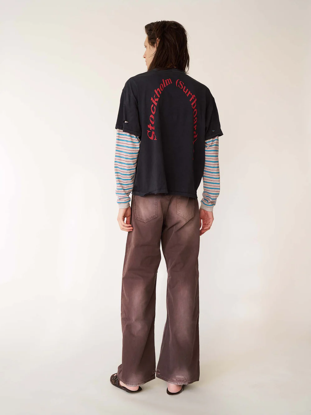 Stockholm Surfboard Club garment dyed t-shirt with contrast striped sleeves. Detailed with distressing and vintage effect back print.