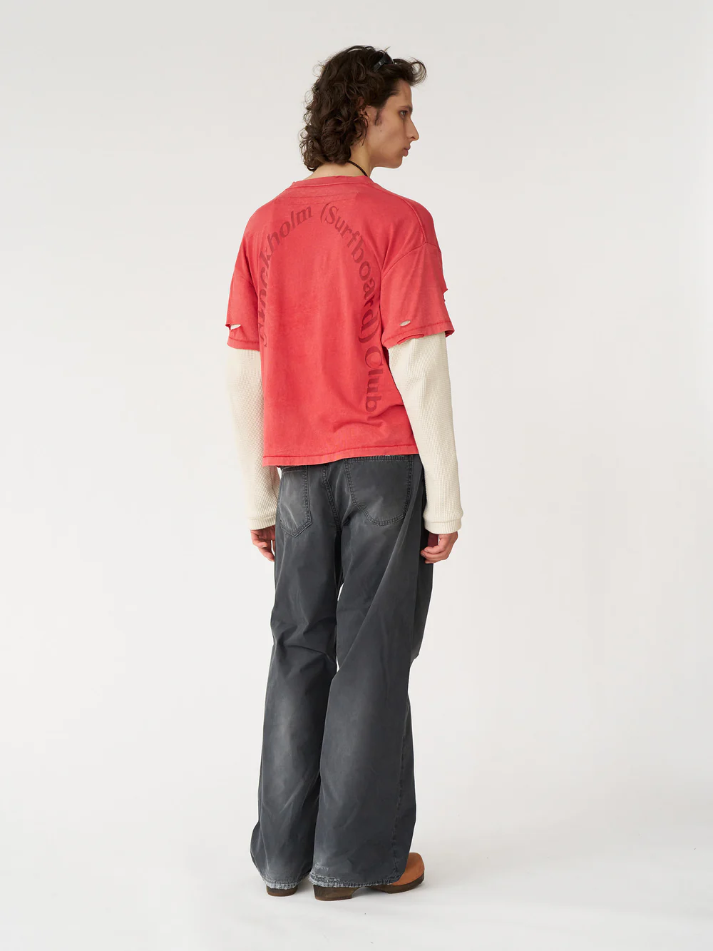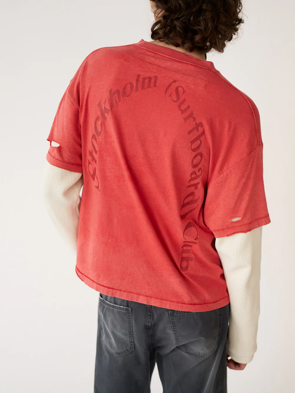 Stockholm Surfboard ClubStockholm Surfboard Club Layer Box Tee - Signature Red €230,00 Incl. btw Op voorraad Toevoegen aan winkelwagenDirect betalenGratis verzending Vanaf €100,-BeschrijvingStockholm Surfboard Club garment dyed t-shirt with contrast striped sleeves. Detailed with distressing and vintage effect back print. Boxy fit Waist length Contrast waffle sleeves Distressed throughout Vintage effect back print 100% Organic Cotton