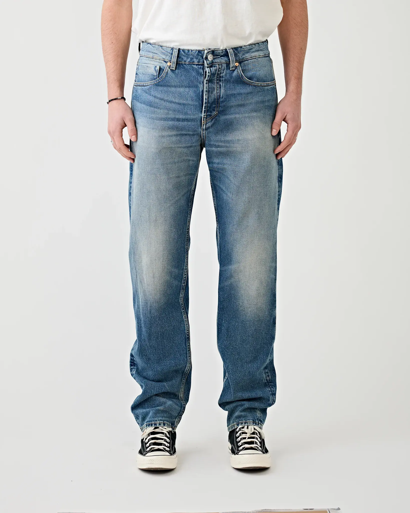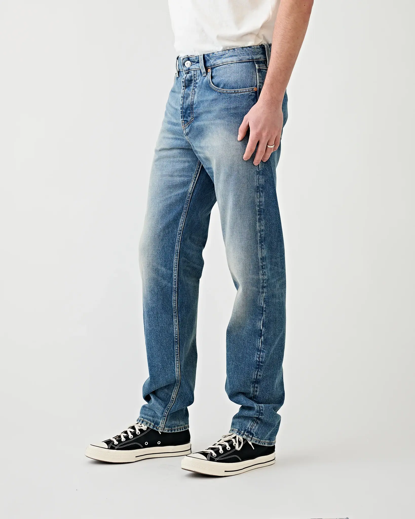 The Penn is a versatile jean: Wear it snug, roomy (one size up) or big and oversized! The Tenue. Penn Pacifica is made from 14.3 oz 100% organic cotton denim and features a mid-blue wash with subtle light fading, creating a soft, approachable vintage vibe with a modern, clean finish. The understated tone makes it easy to style for both casual and slightly dressed-up looks. Penn jeans are made in our jeans factory near Umbertide, Italy.
