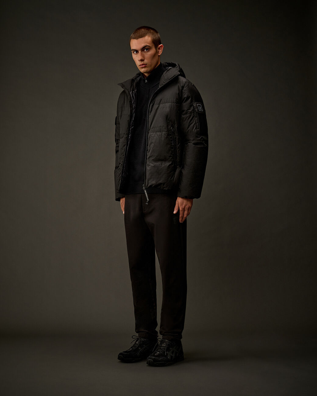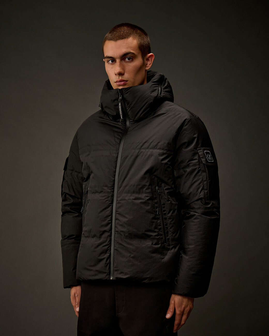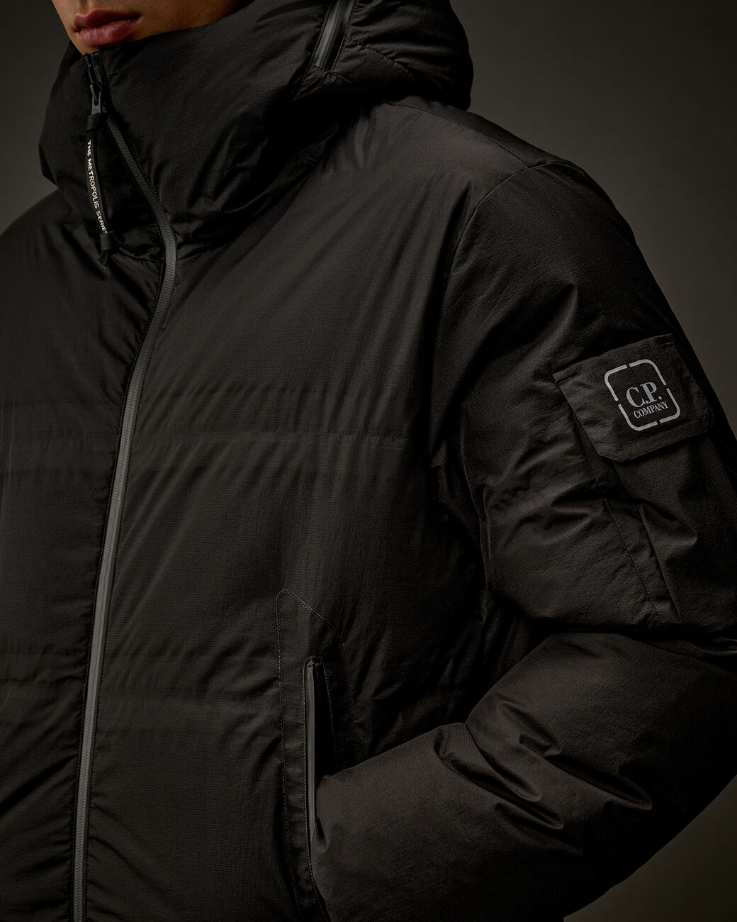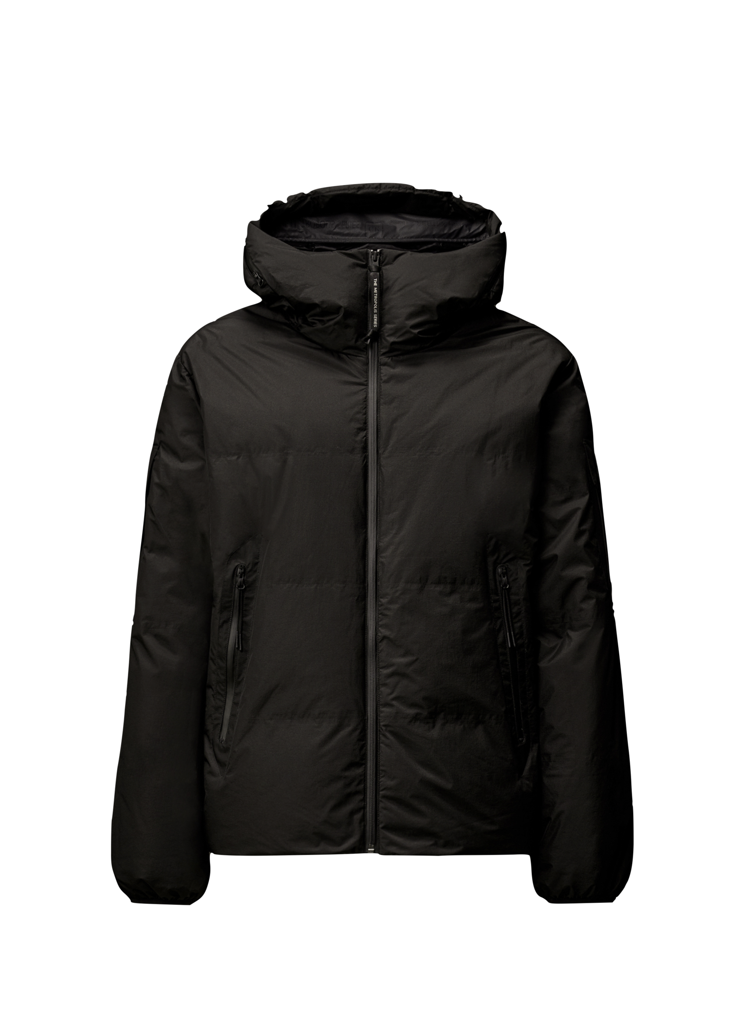 Full zip hooded down jacket crafted in Pertex®, an ultralight 2.5-layer ripstop fabric with a waterproof membrane and breathable micro-embossed backing. The baffled construction, achieved through heat-bonded tapes, eliminates cold spots and prevents feather loss. The jacket features an adjustable hood with top zip opening, and sleeve flap velcro pockets with printed logo badge. Complete with side zip pockets, elasticated cuffs, and an adjustable drawstring hem. Regular fit.