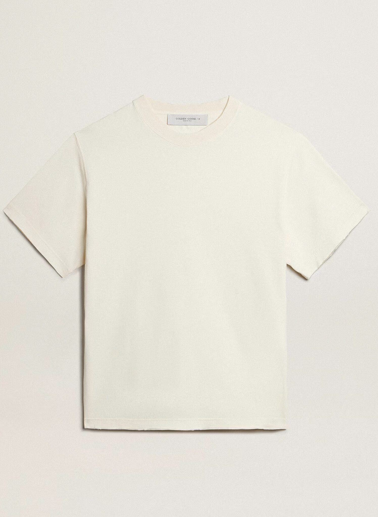 A unique, timeless collection that encapsulates the Golden Goose DNA, designed to remain with you every day, through thick and thin, come rain or shine. In aged white cotton with a distressed finish, this T-shirt features a raised reverse Golden logo on the back.
