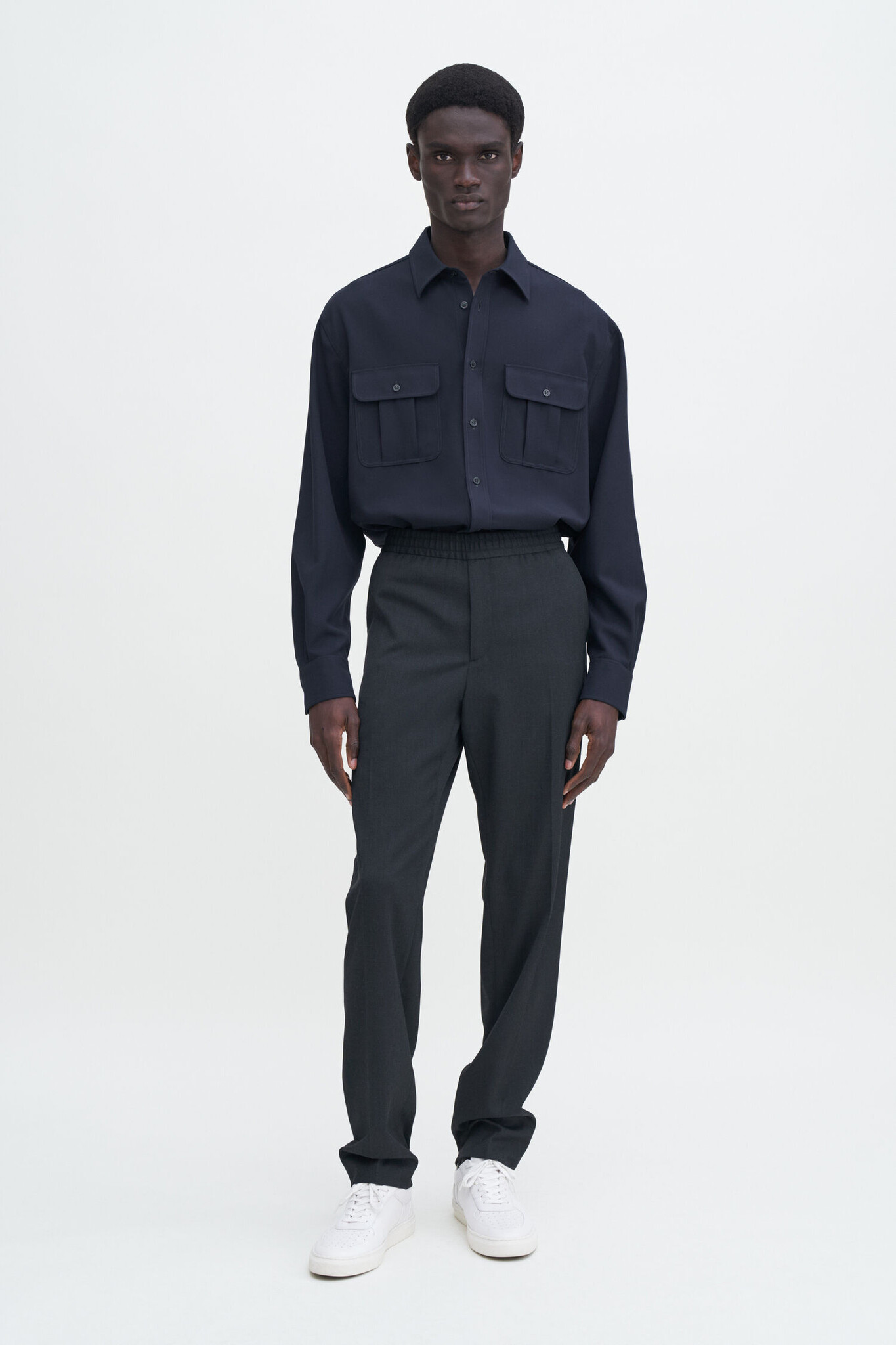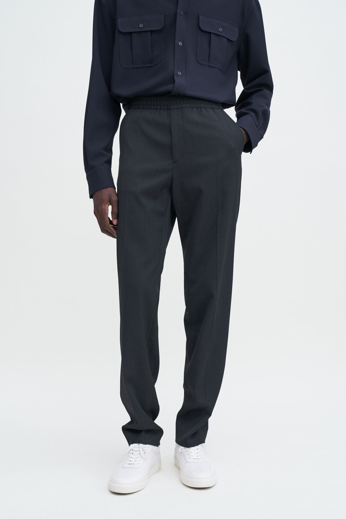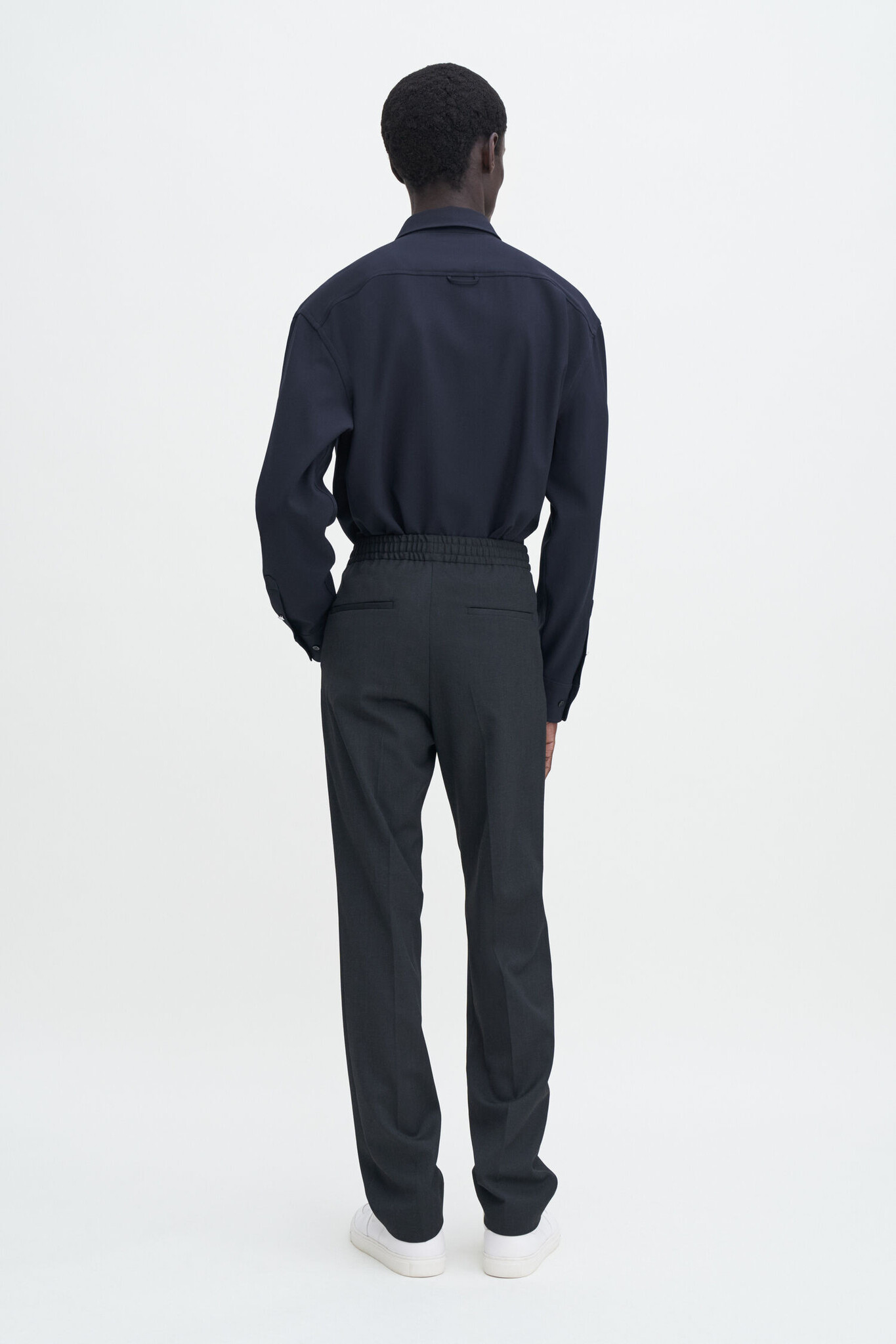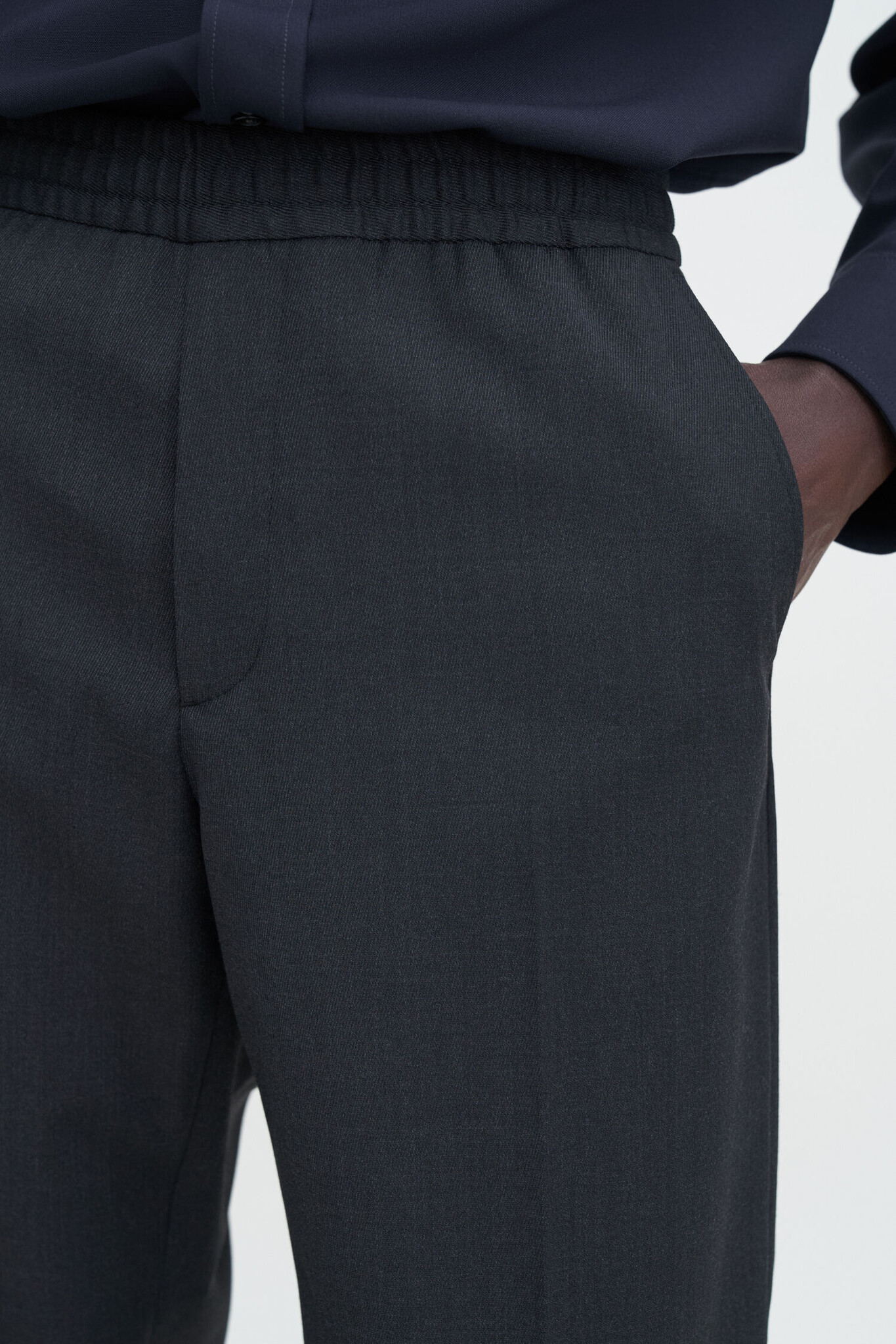 De ontspannen wollen broek heeft een ontspannen taps toelopende pasvorm met een middelhoge taille en lange pijpen. Hij is gemaakt van antraciete cavalerie-keperstof en heeft een elastische tailleband met een verborgen trekkoord. Draag hem met het wollen twill shirt voor een moderne, meer casual interpretatie van een pak. Ga voor de Terry cropped broek voor een vergelijkbare stijl met een kortere lengte.