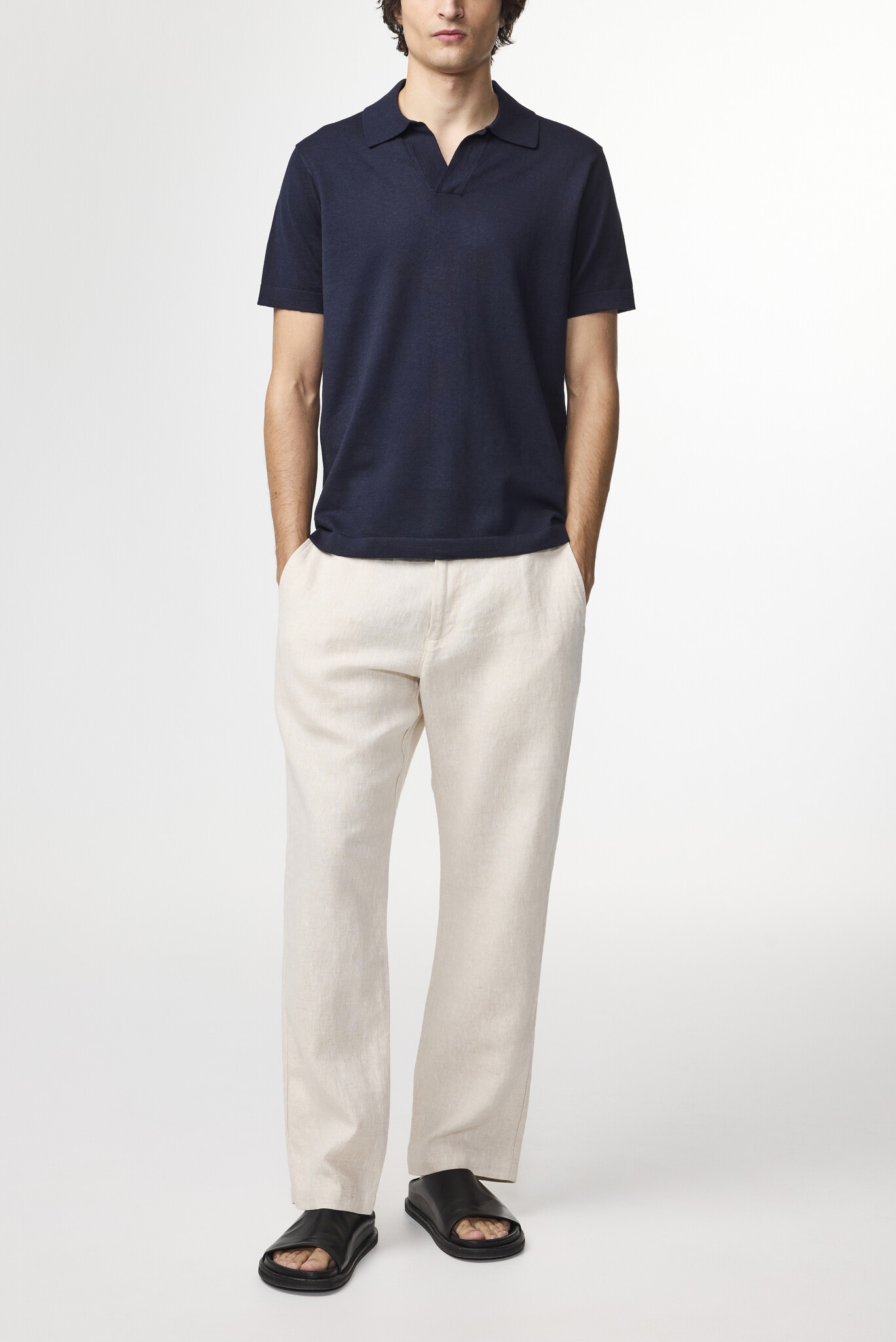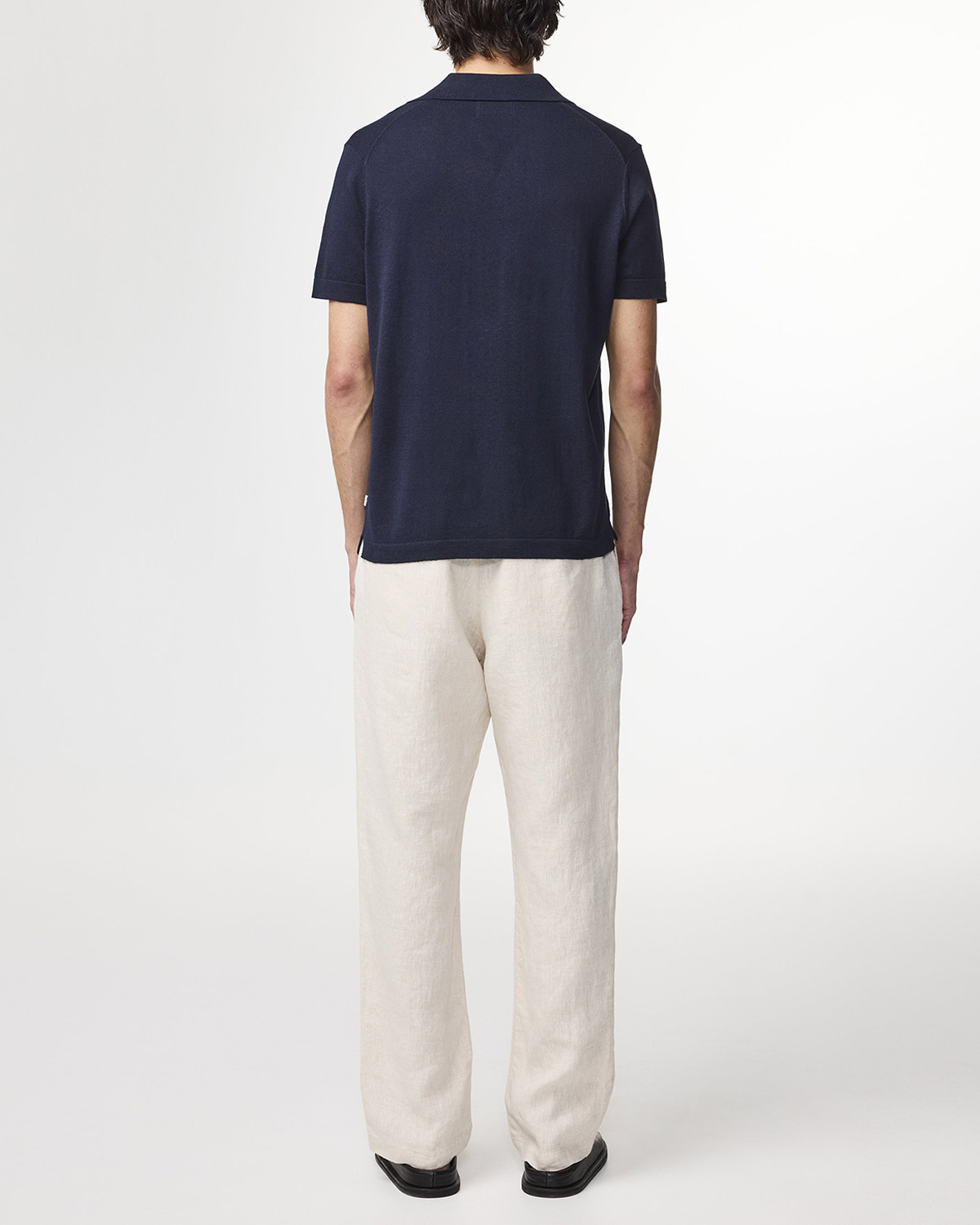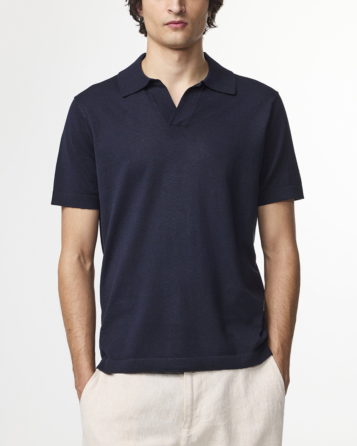 Lightweight open-collar polo crafted in a soft cotton-linen blend jersey. Features side slits and an ultra-breathable design that delivers exceptional comfort and a delicate handfeel.