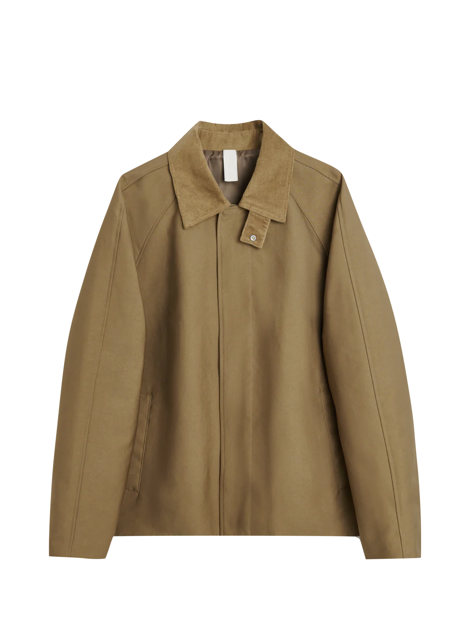 ProductomschrijvingShort car coat with raglan sleeves and contrast corduroy collar Double face cotton nylon coating fabricPush button closure with hidden placketCorduroy collar in contrastViscose liningPaspel pockets on front