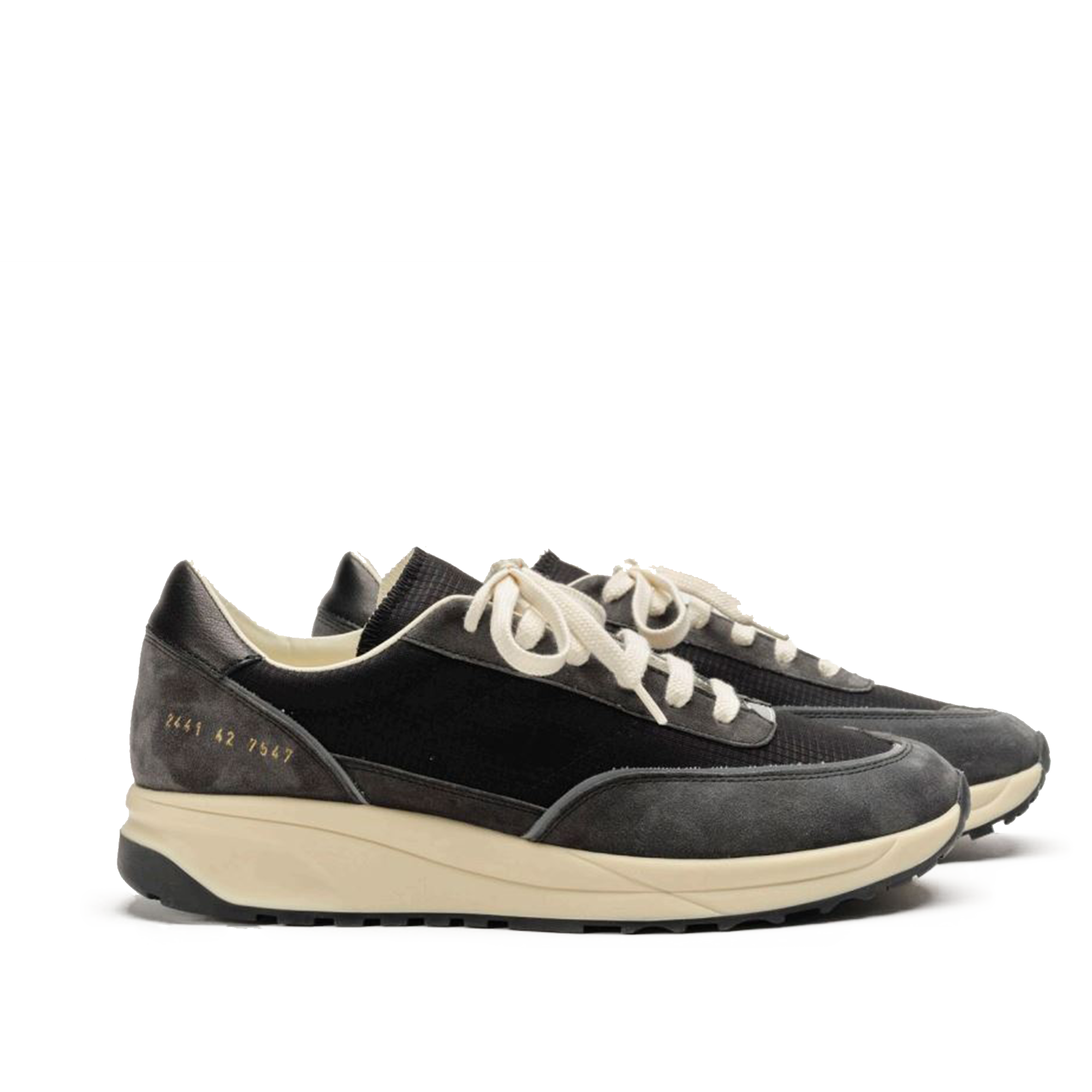 Common ProjectsCommon Projects Track Classic – Black €480,00 Incl. btw Niet op voorraad 41 42 43 44 45Maat: *4142434445Niet op voorraadGratis verzending Vanaf €100,-BeschrijvingSuede and nylon upper, white cotton laces and classic track sole. Gold foil article stamp at heel counter.