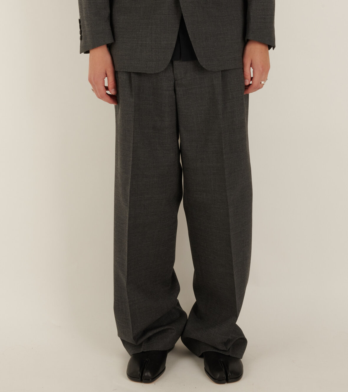 The trousers have pleats at the top of the front and press pleats down the legs. The fit is slightly relaxed with straight wide legs. They are produced in Portugal.