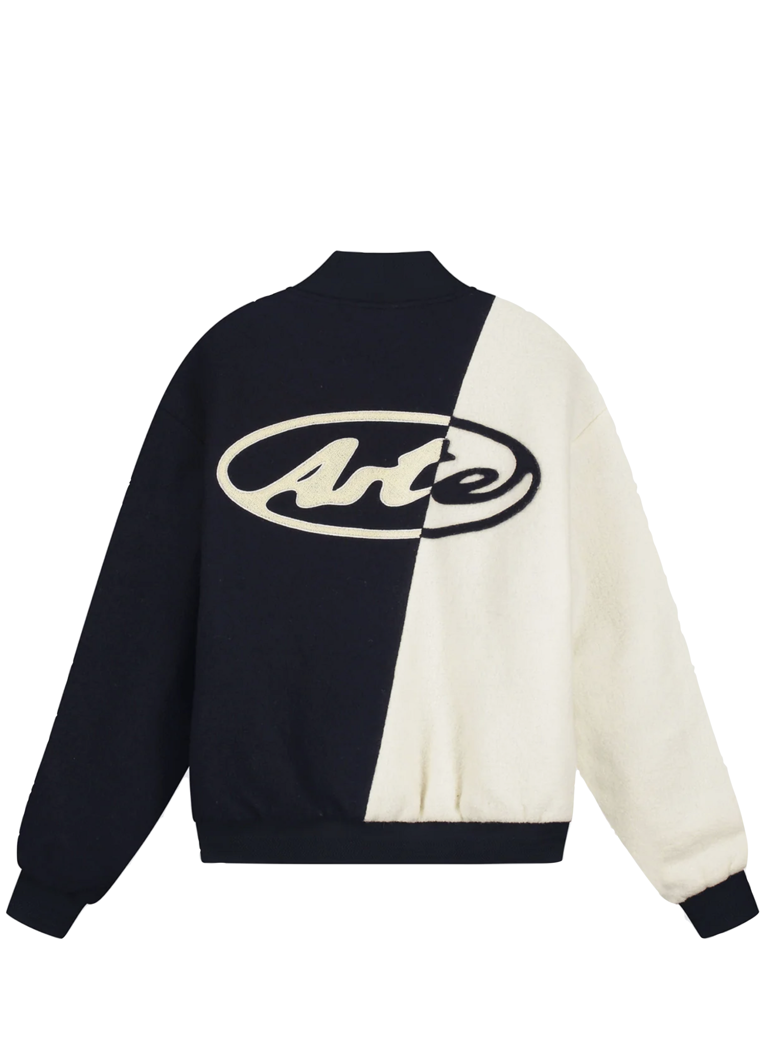 Channeling the theme of the collection, the jacket features a seasonal Arte logo across the back that is divided by a seam that runs diagonally across the piece. The logo is partially stitched in white wool, and partially in navy leather. The jacket has a zipper closure, two side pockets, elasticated trims and is finished with a white embroidered logo on the left of the chest.